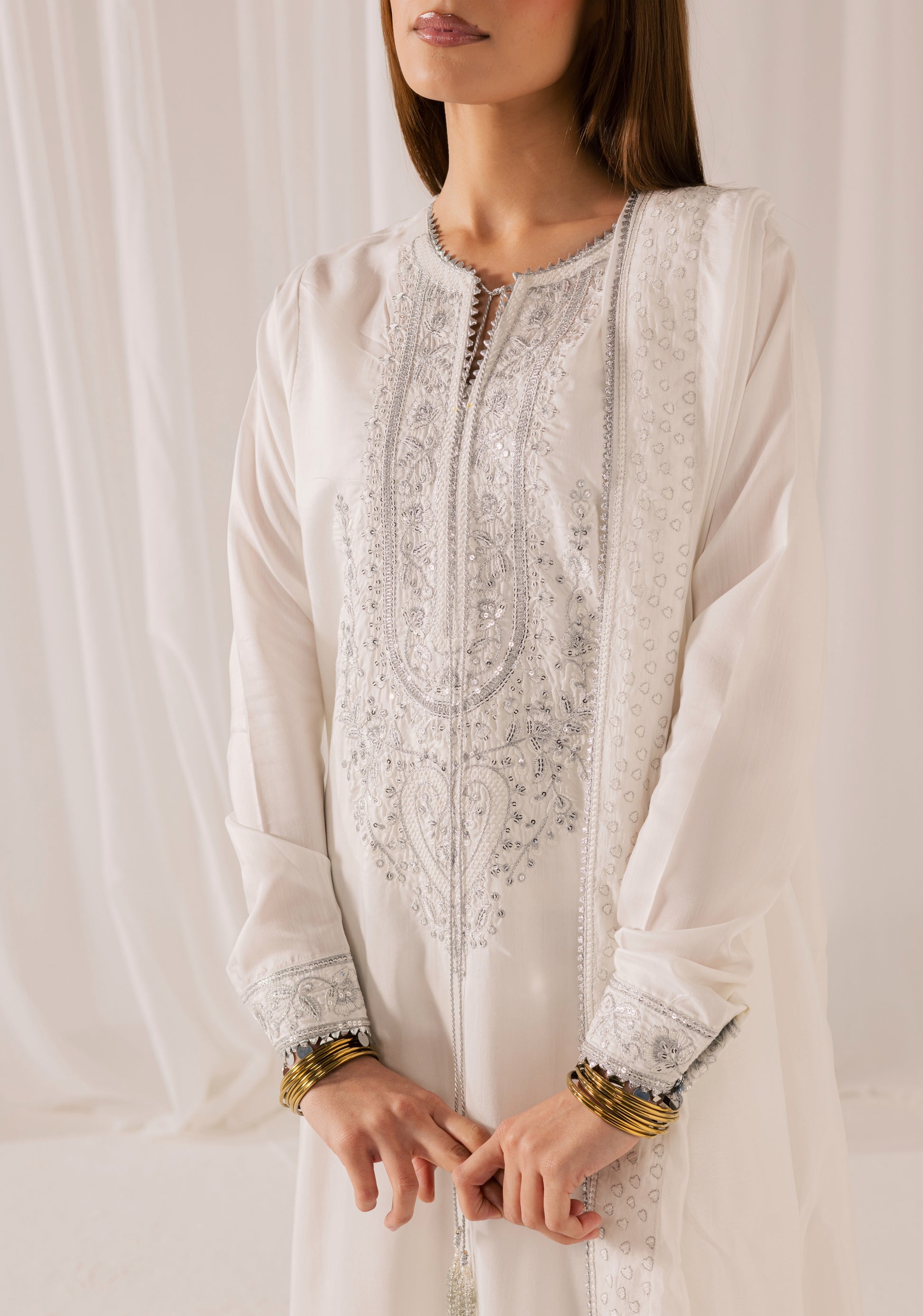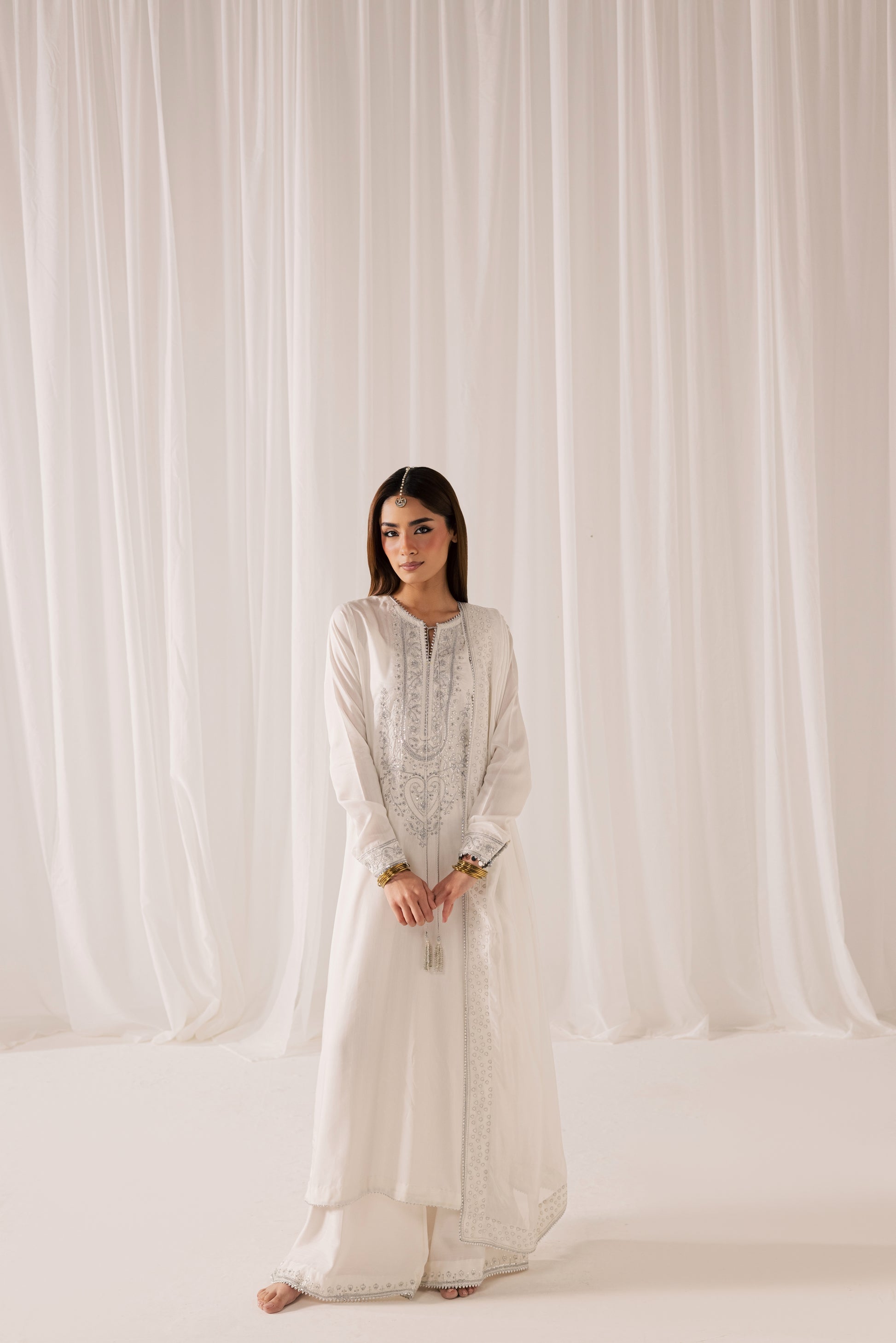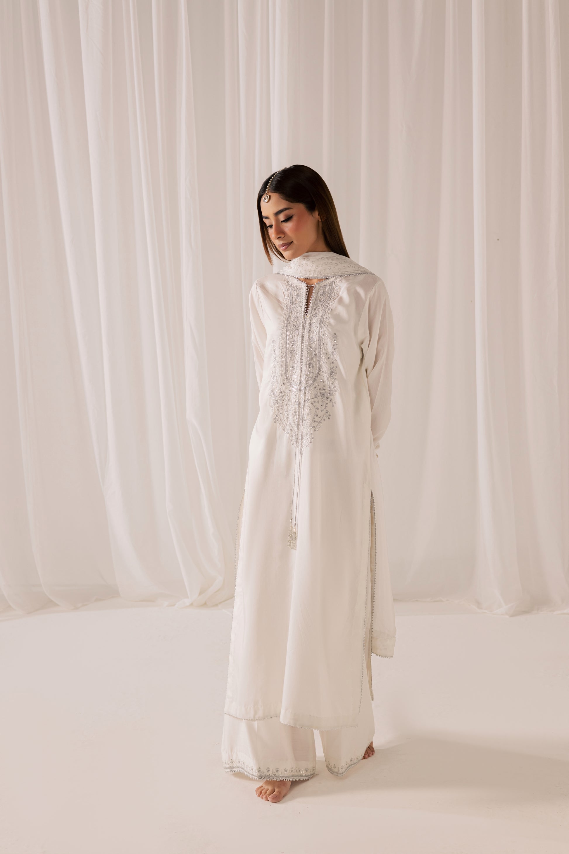 Description: A pristine white ensemble elevated with intricate tilla embroidery and delicate sequin work that catches the light with subtle brilliance. The elongated shirt features detailed craftsmanship along the neckline and front panel, paired with tailored wide-leg trousers for a refined, statuesque silhouette. Finished with a softly draped dupatta, this look embodies pure elegance, designed for those who appreciate timeless luxury with luminous detail.