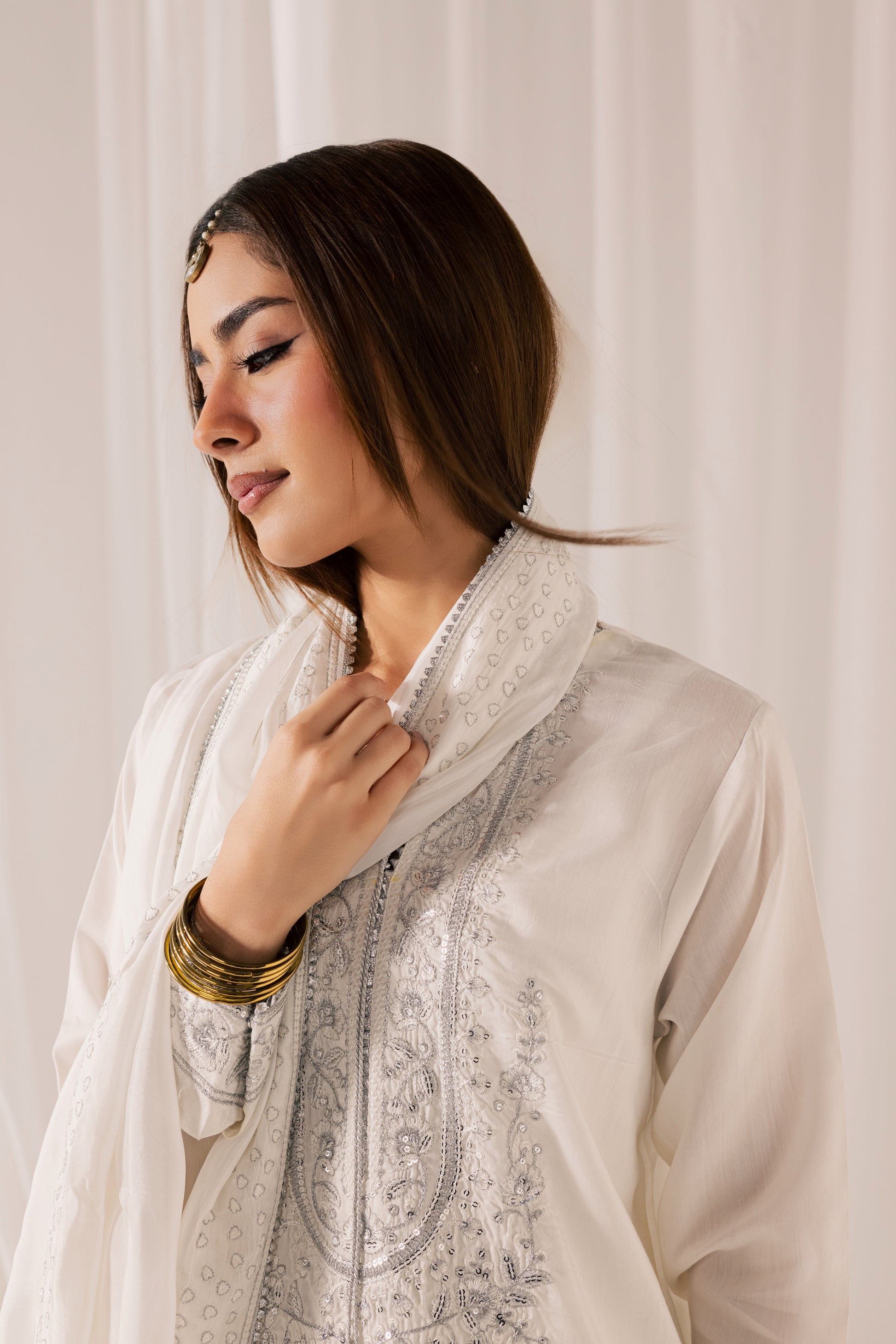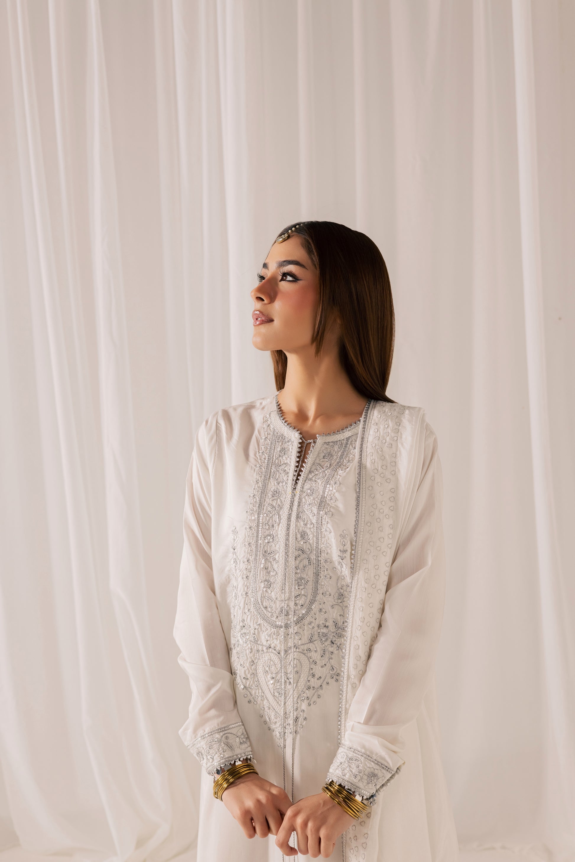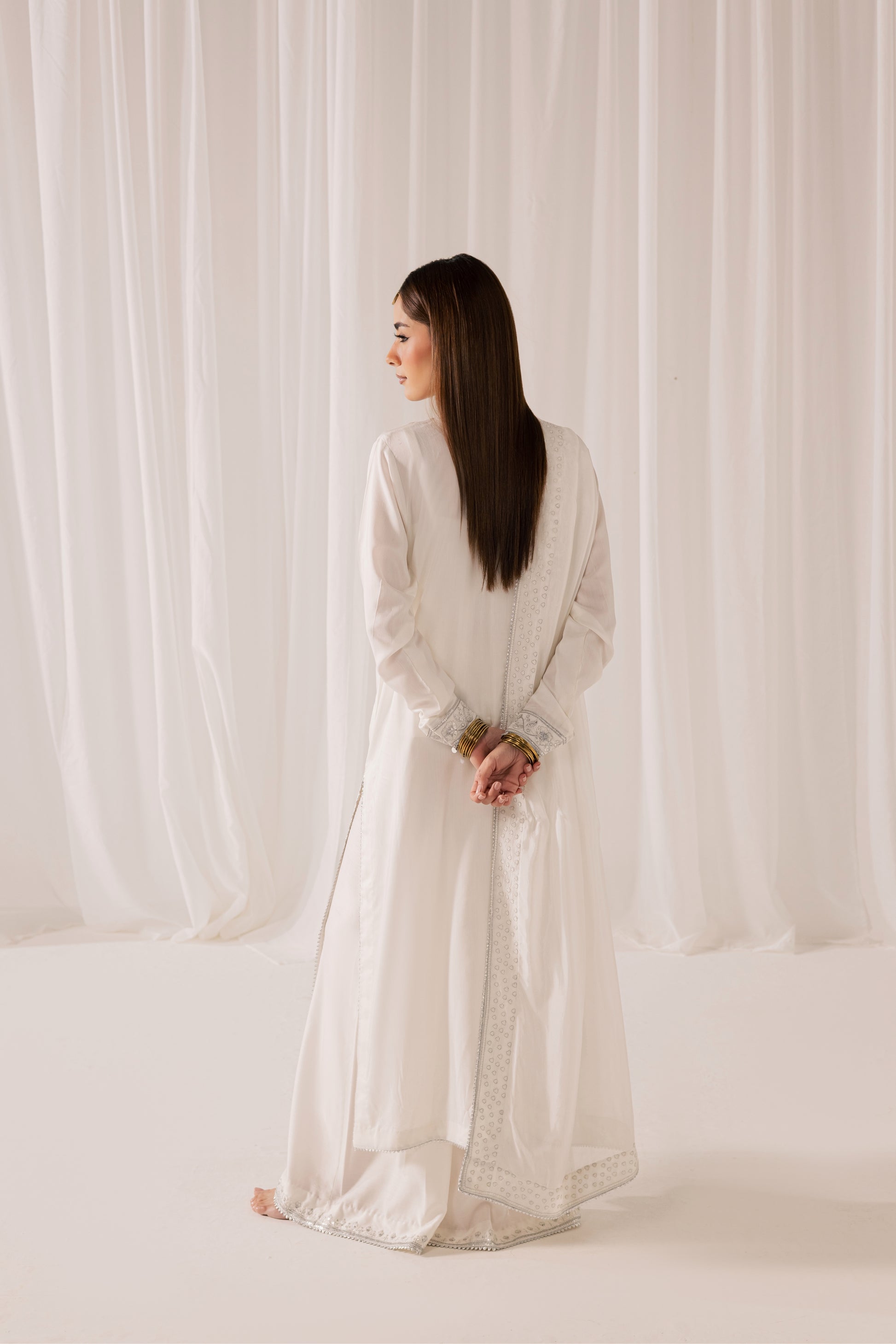 Description: A pristine white ensemble elevated with intricate tilla embroidery and delicate sequin work that catches the light with subtle brilliance. The elongated shirt features detailed craftsmanship along the neckline and front panel, paired with tailored wide-leg trousers for a refined, statuesque silhouette. Finished with a softly draped dupatta, this look embodies pure elegance, designed for those who appreciate timeless luxury with luminous detail.