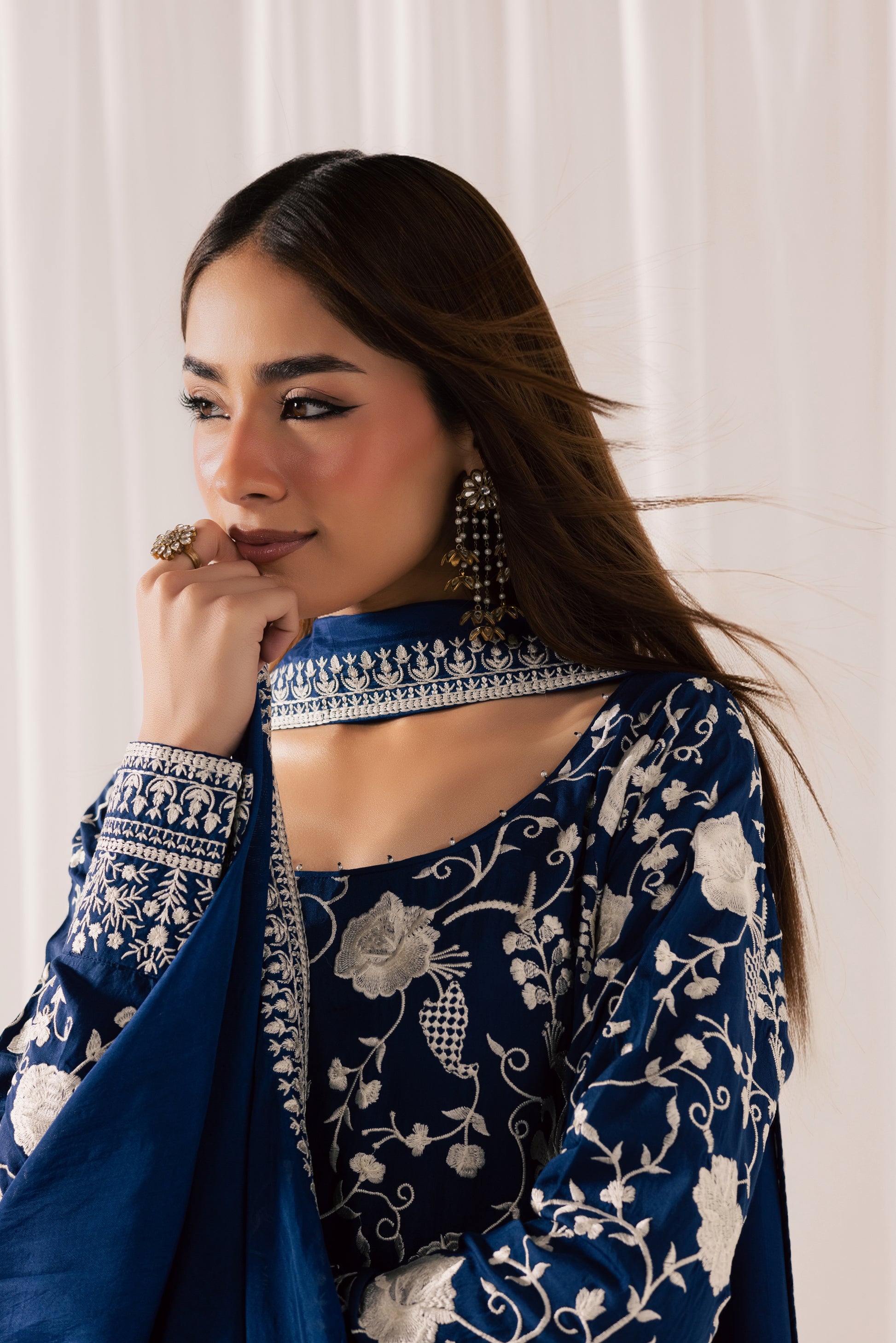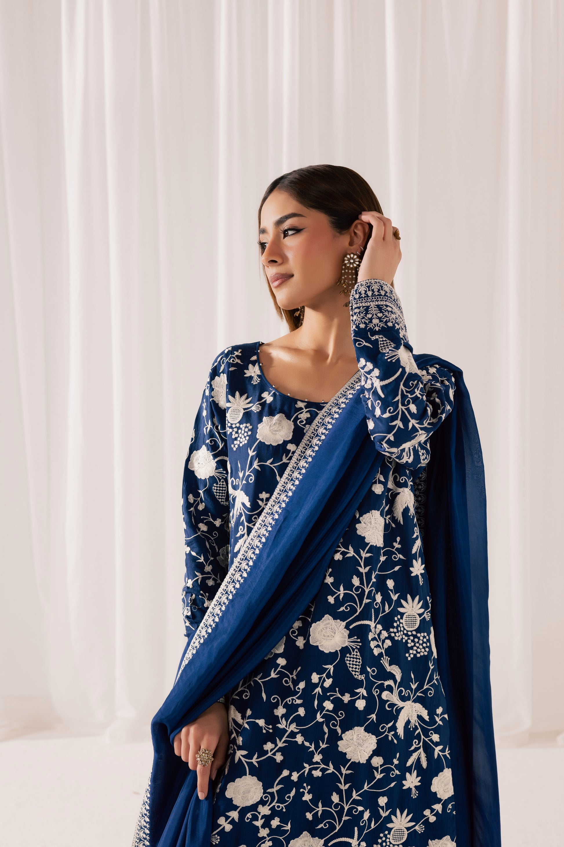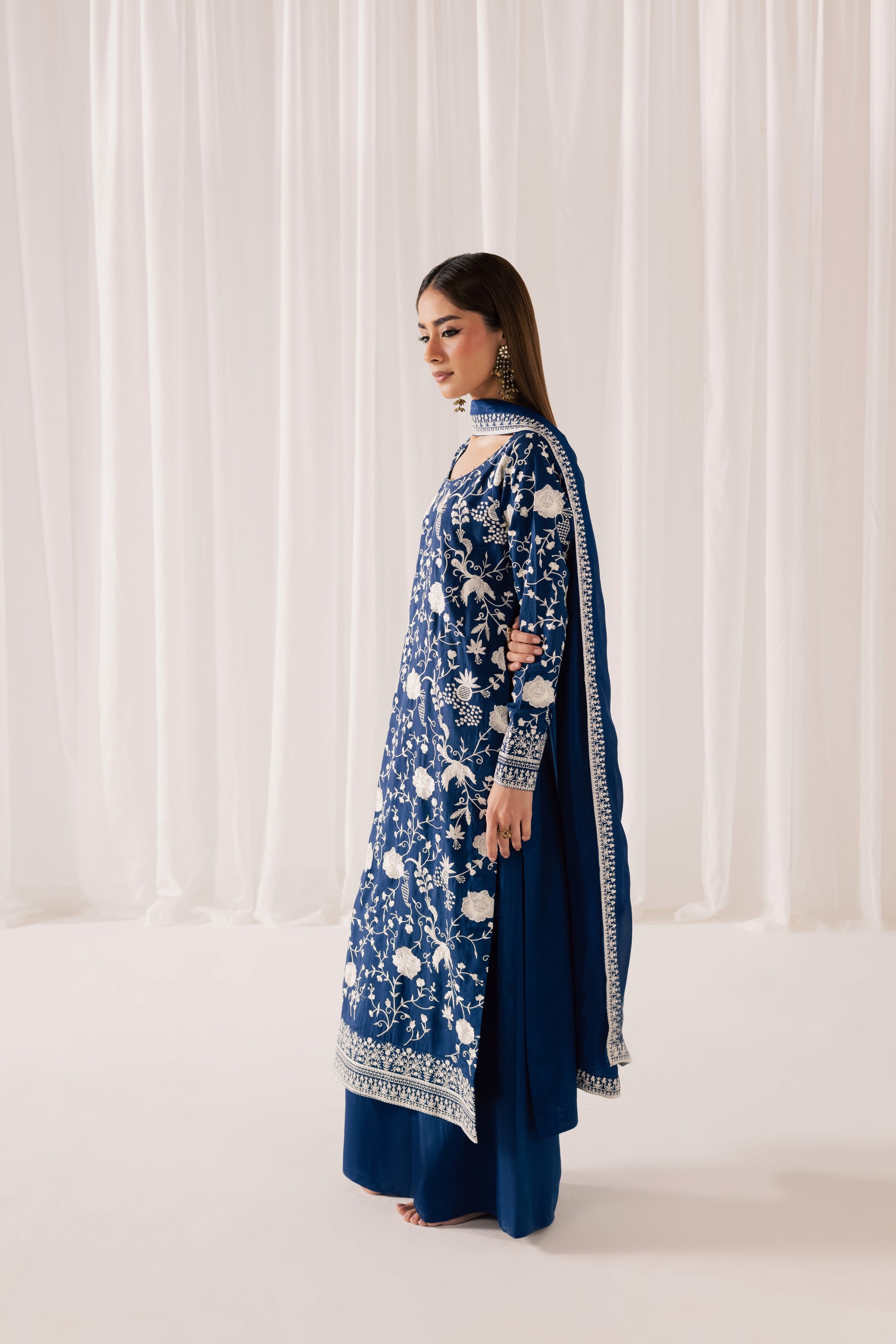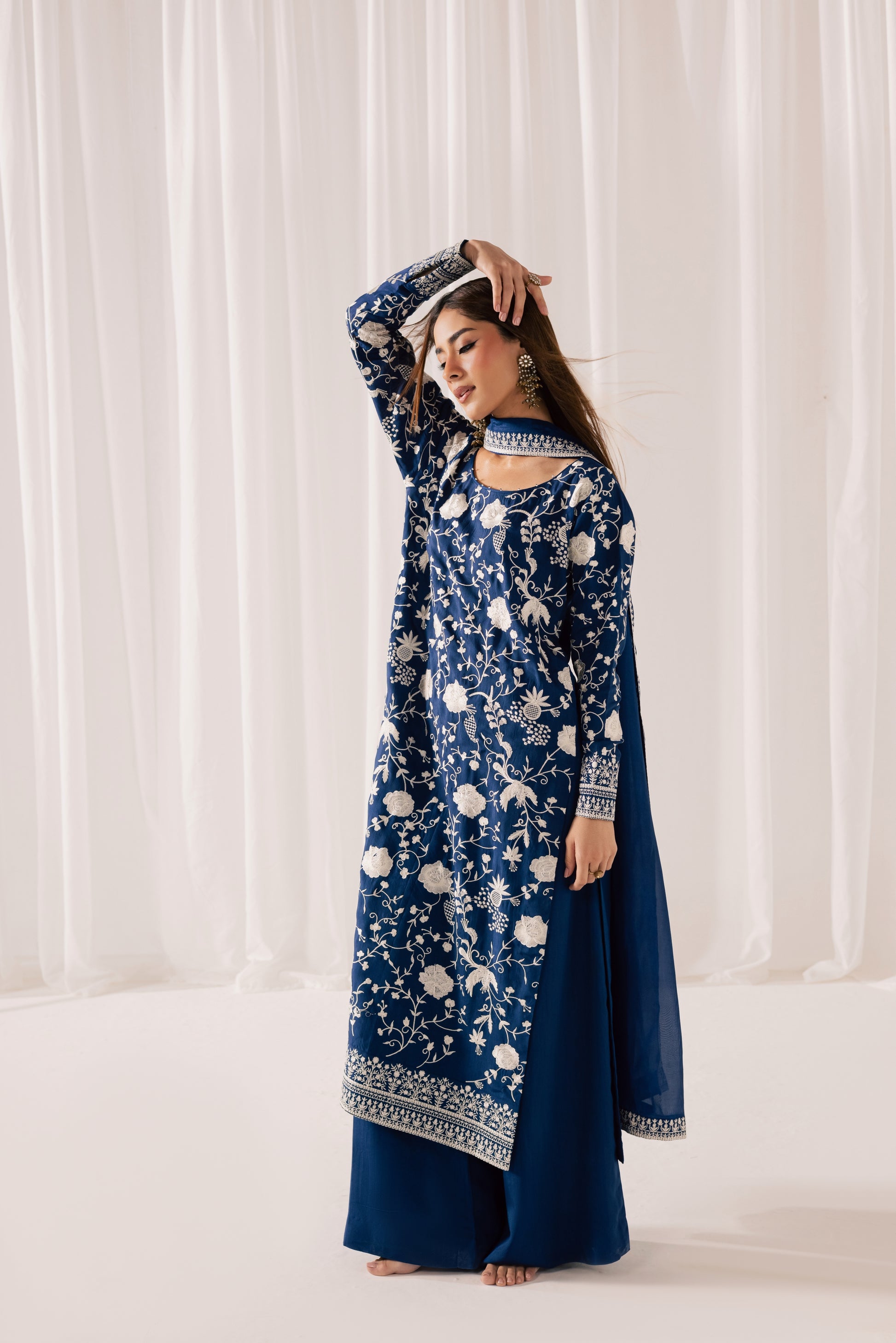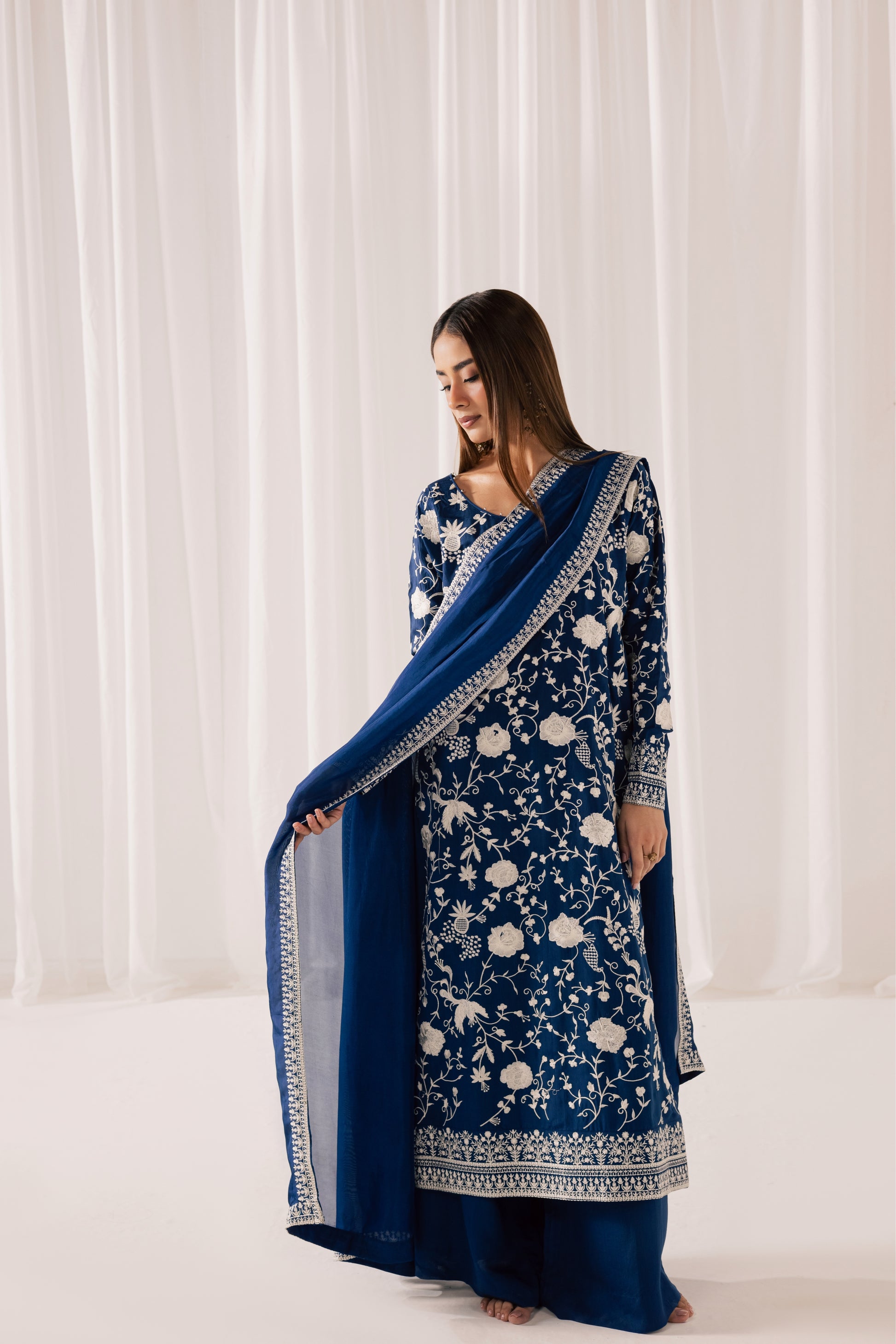 Description: A regal midnight blue silk silhouette, exquisitely adorned with intricate gara embroidery that weaves delicate florals across the canvas like fine artistry. The elongated shirt is paired with fluid, wide-leg silk trousers that move with graceful ease, while a sheer, coordinating dupatta framed with detailed borders completes the ensemble. Rich in heritage craftsmanship and elevated in finish, this piece is a timeless expression of understated opulence.