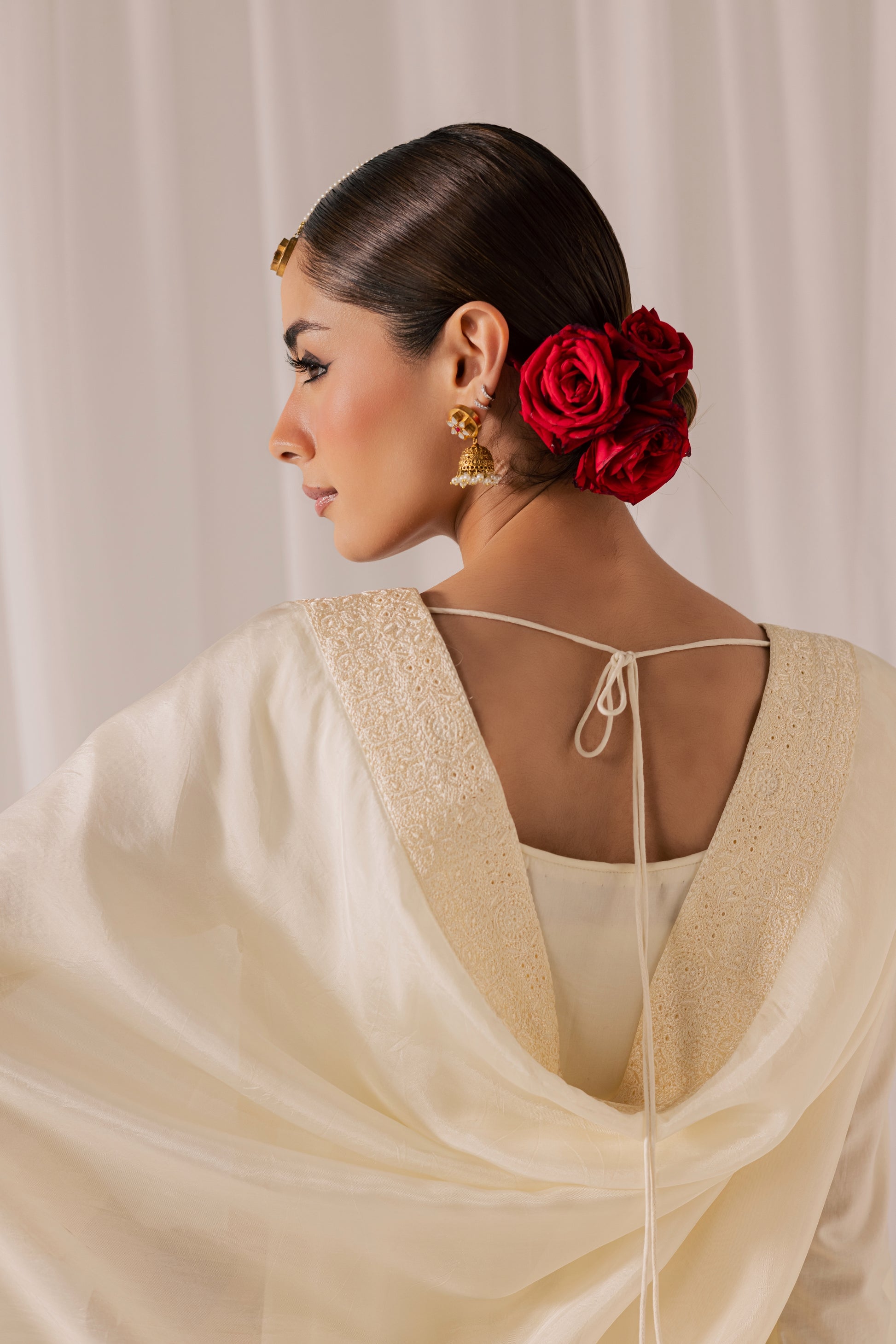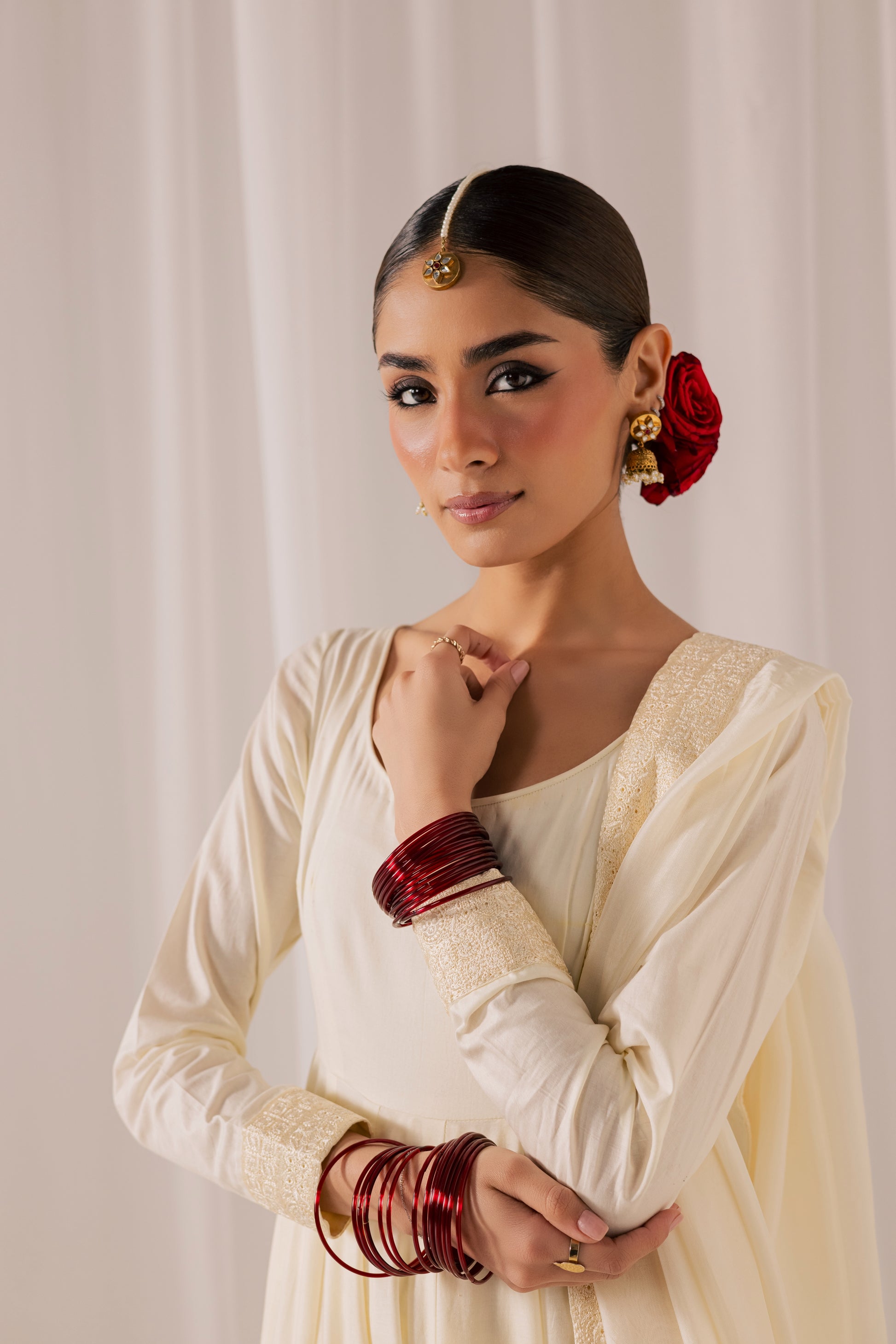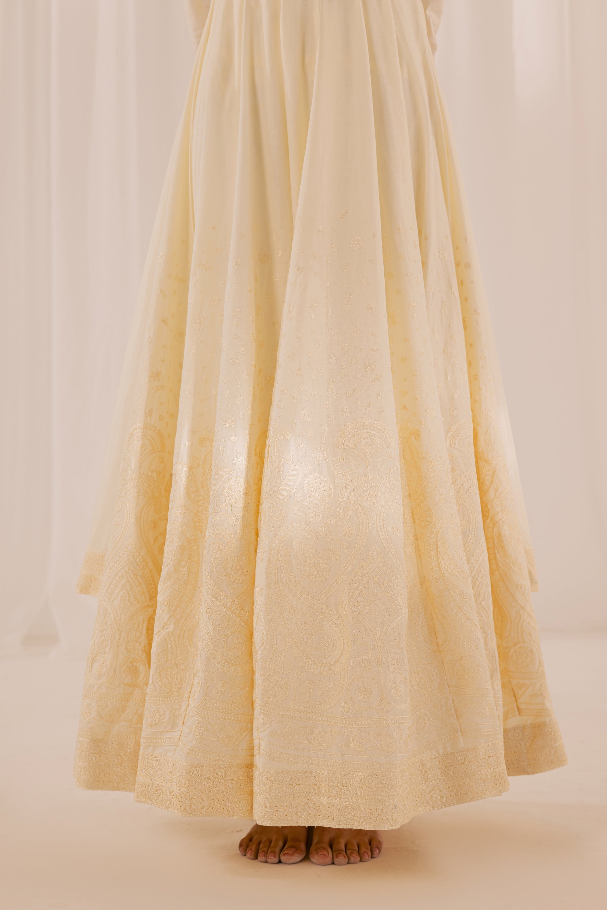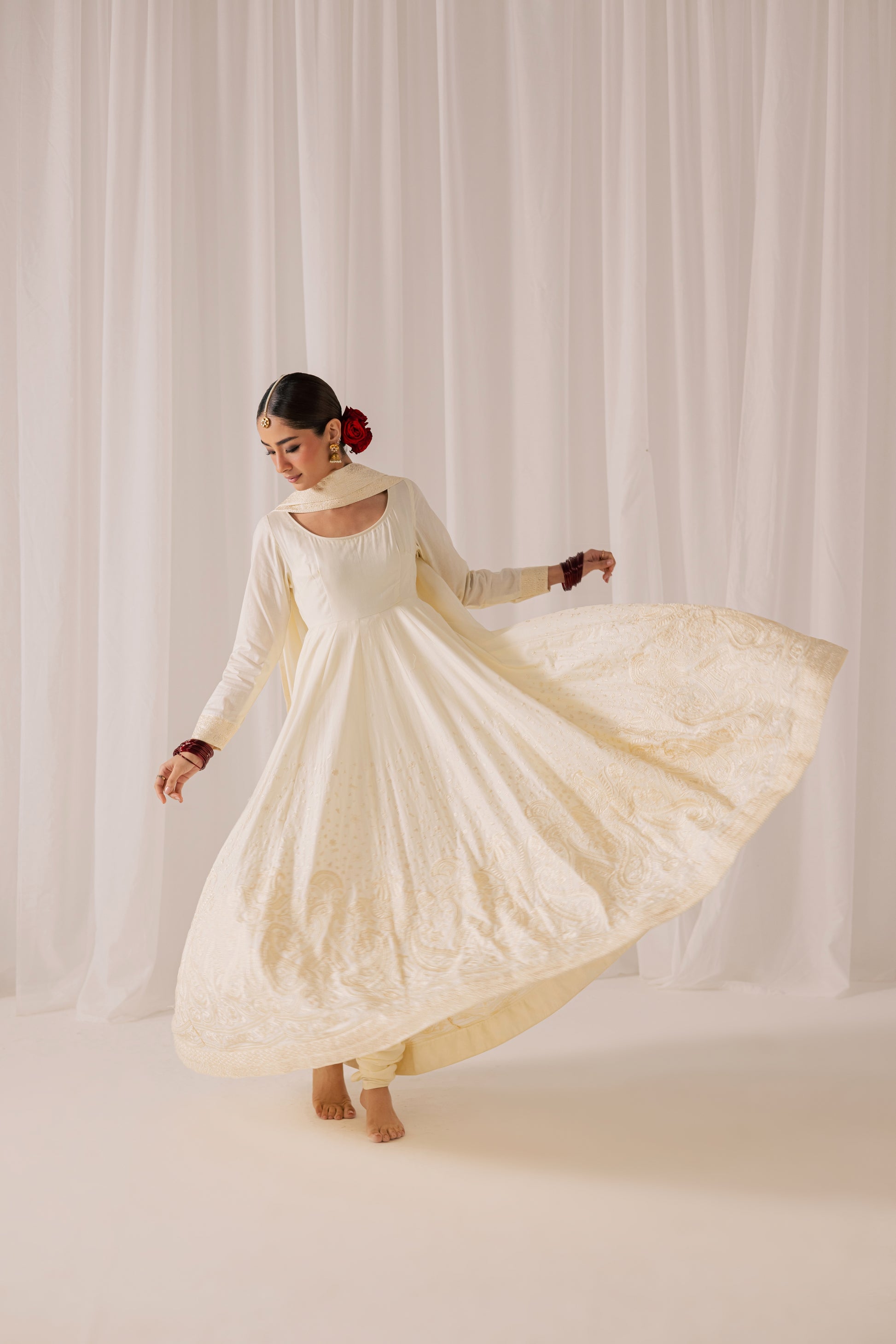 Description: A breathtaking ivory peshwas designed to embody grace and grandeur. Cut in a flowing, voluminous silhouette, this timeless piece is enriched with intricate embroidery that unfolds beautifully across its flared expanse. The fitted bodice transitions into a sweeping skirt, creating poetic movement with every step. Paired with a coordinating churidar and a soft dupatta, this ensemble captures the romance of tradition with a refined, couture-inspired finish.