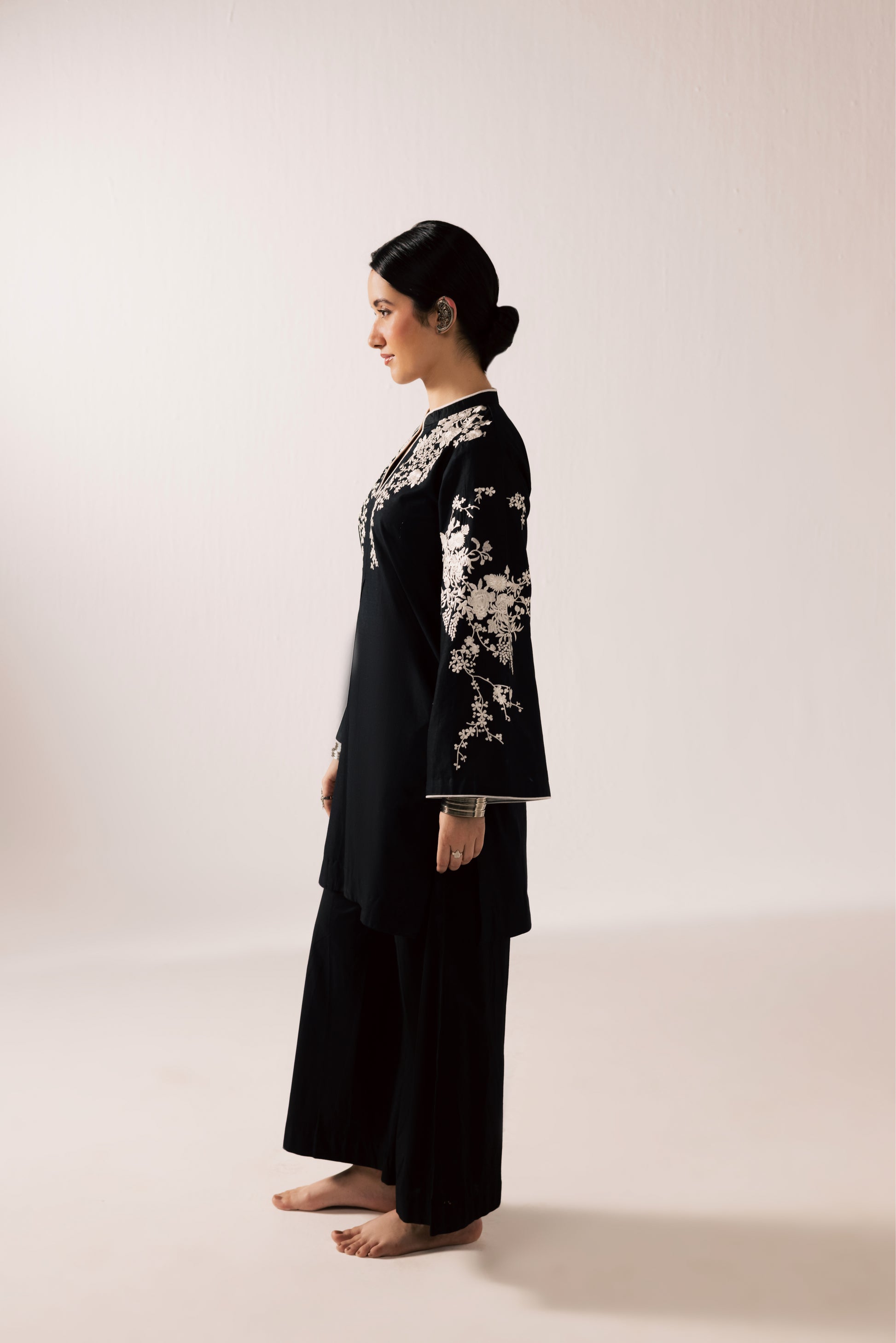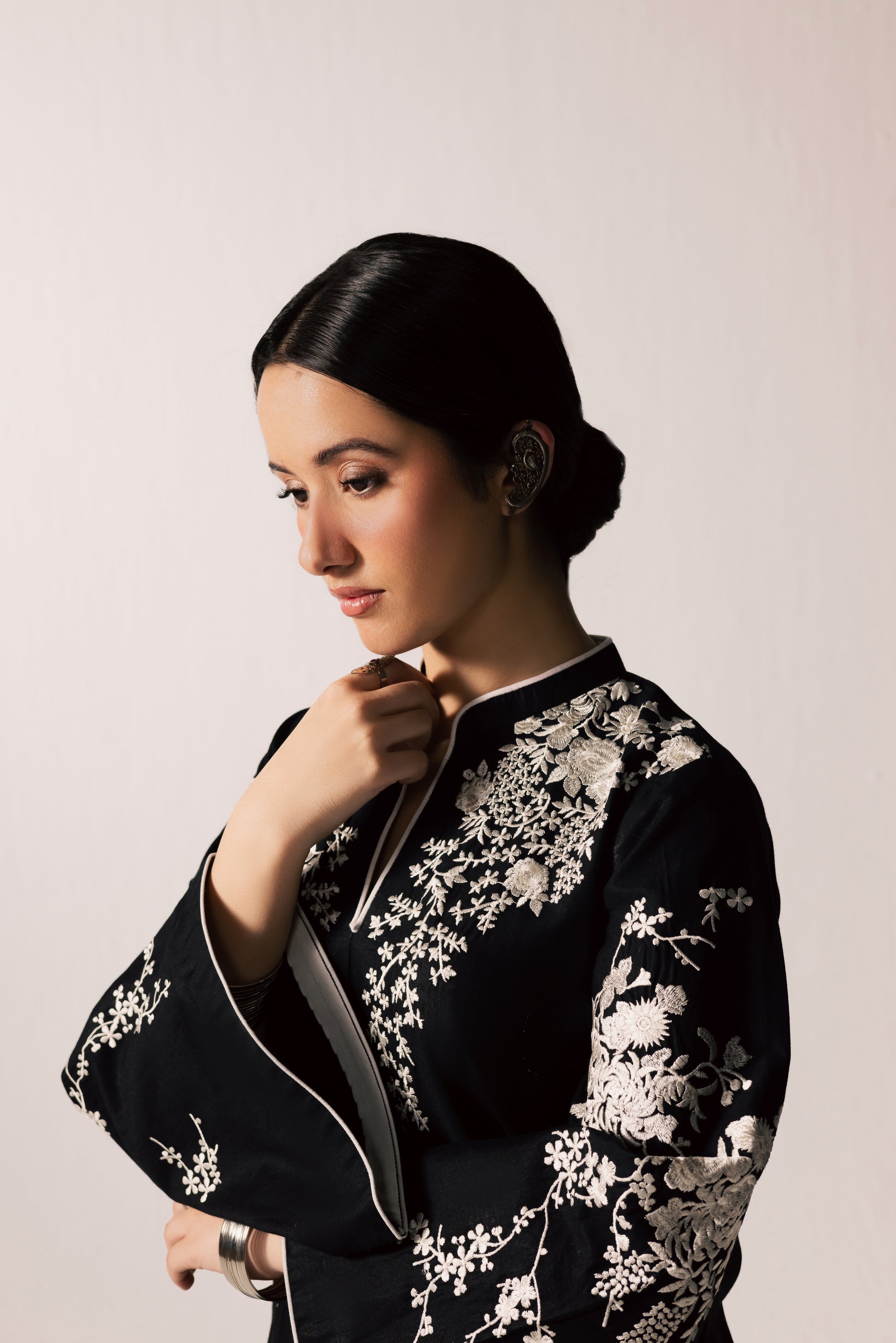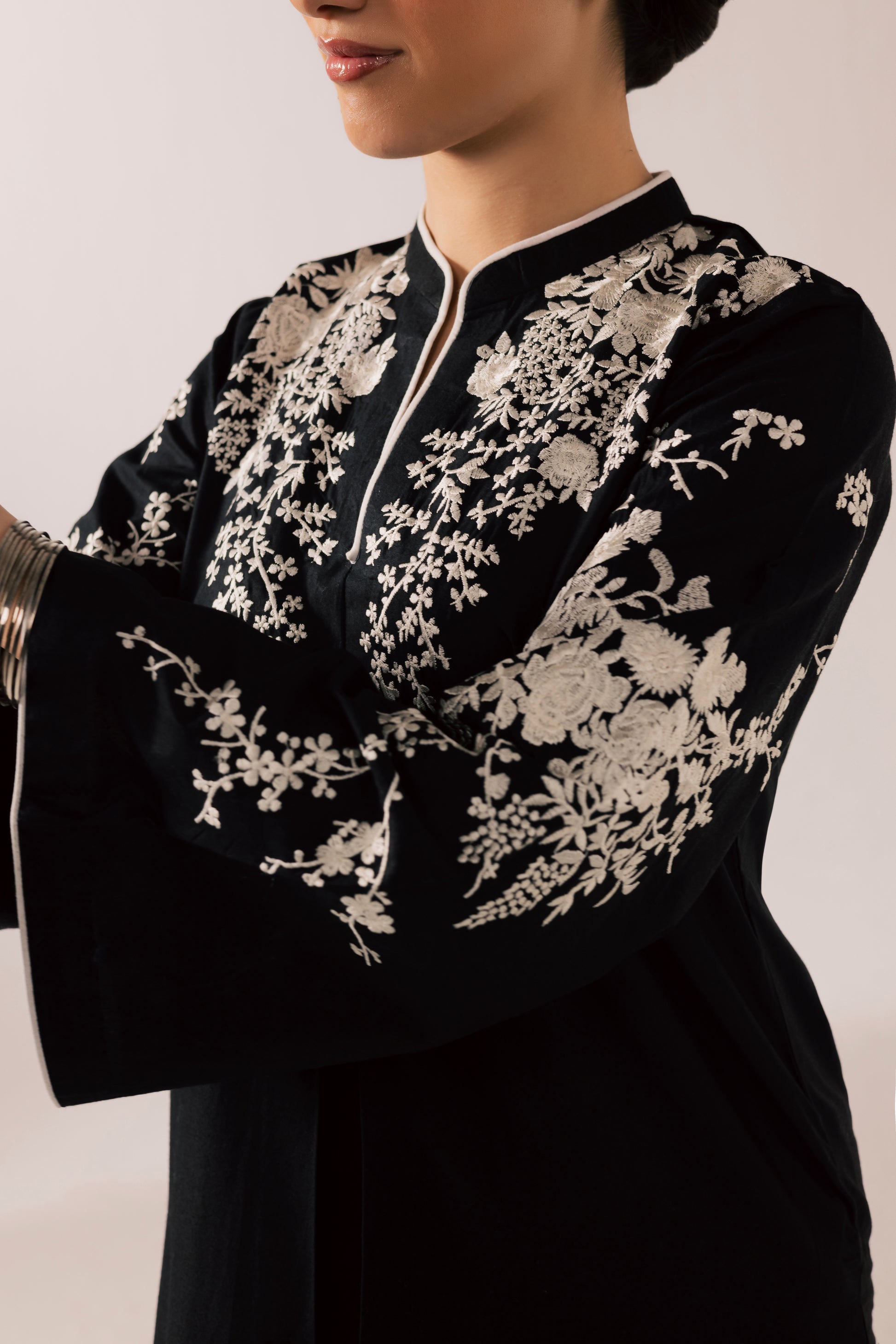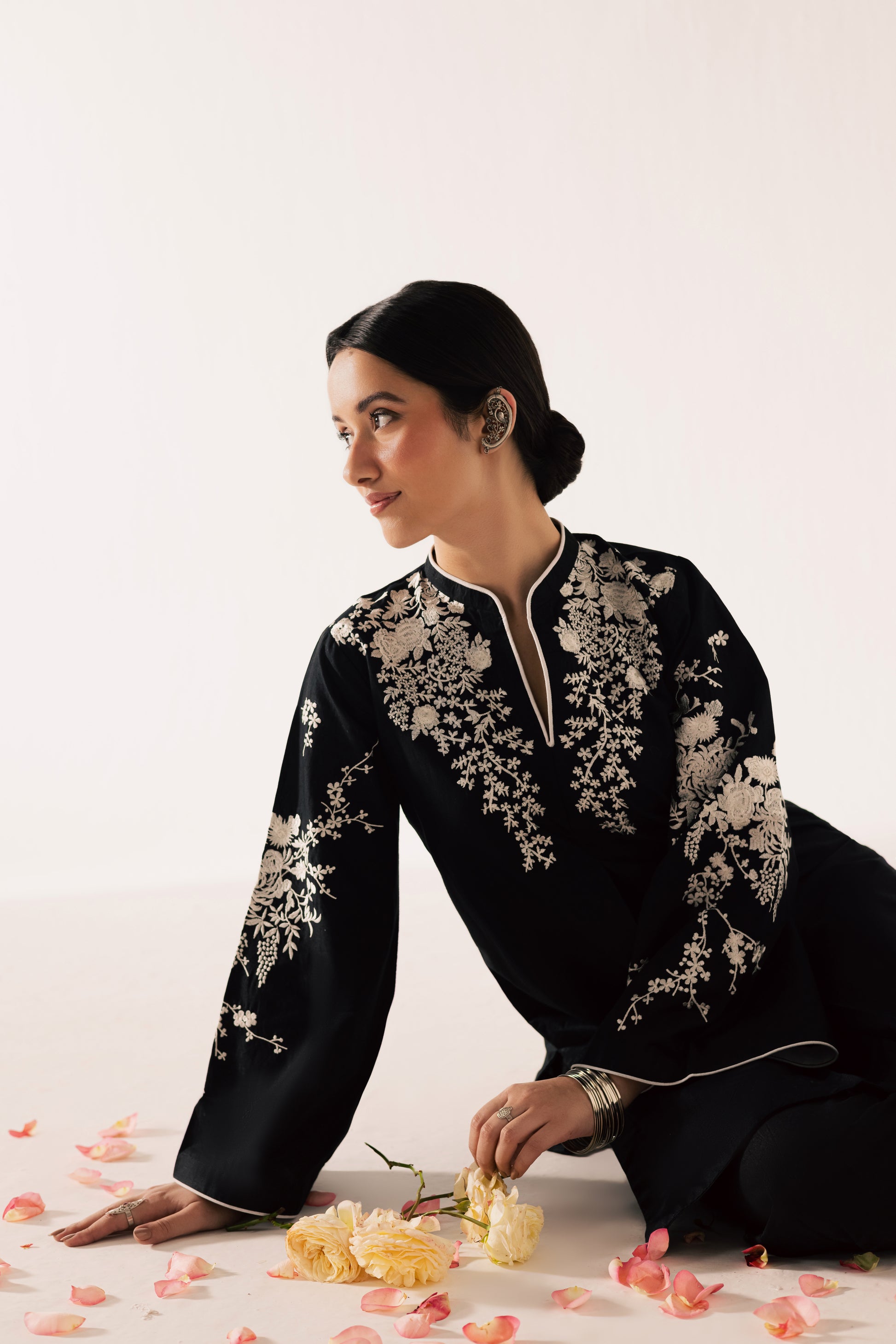 A box-pleat black shirt designed in a straight silhouette with a clean slit neckline and statement bell sleeves. Ivory floral embroidery cascades across the neckline and sleeves, creating a striking contrast against the dark base. Paired with wide-leg trousers for a balanced, elegant finish.